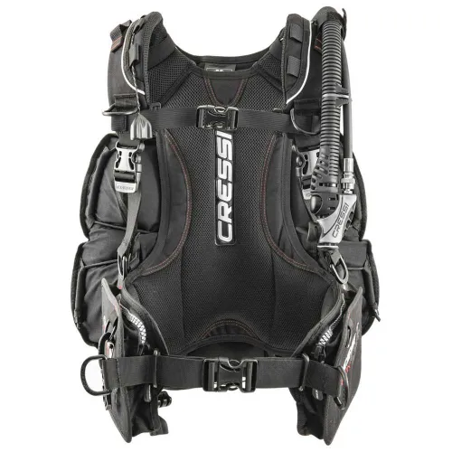 The SCORPION Jacket is an impressively light high-buoyancy rear-mounted BC, anatomically designed for maximum comfort and wearability. Its main features are its detachable harness and air cell.The rear-mounted air cell interferes neither with the main underwater component nor with the adjustment straps, not even when it is inflated to the maximum: this means extra freedom of movement and buoyancy for the diver.The special air cell compression strap guarantees extra quick deflation and volume control.The ultralight semi-rigid harness ensures optimal stability and high comfort with its air-net fabric.Its integrated Cressi Flat-Lock-Aid Weight System makes extra easy to release the pockets.