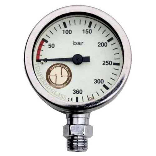 Dive with unwavering confidence using the DE PROFUNDIS Dir Pressure Gauge. This essential instrument ensures your safety by providing precise, at-a-glance monitoring of your air supply. Built to withstand the rigors of any dive, its robust, corrosion-resistant construction guarantees lasting performance. The crystal-clear dial, featuring large luminous markings, offers effortless readability even in low-light or murky conditions. Compact, lightweight, and universally compatible with most regulators, this gauge is the reliable choice for serious divers who demand accuracy and durability