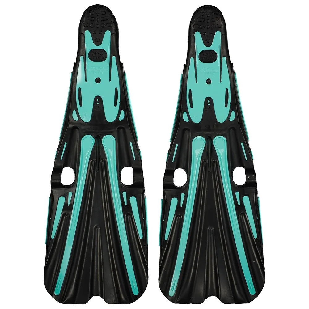 - Soft longitudinal inserts allow a controlled deformation of the fin blade while kicking. This channel shape moves a greater amount of water resulting in more thrust for the same effort.