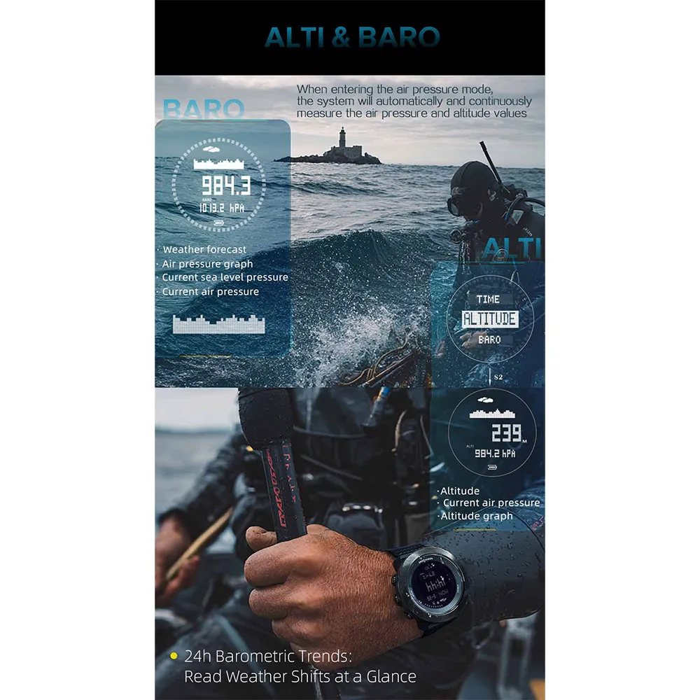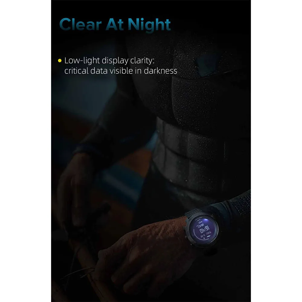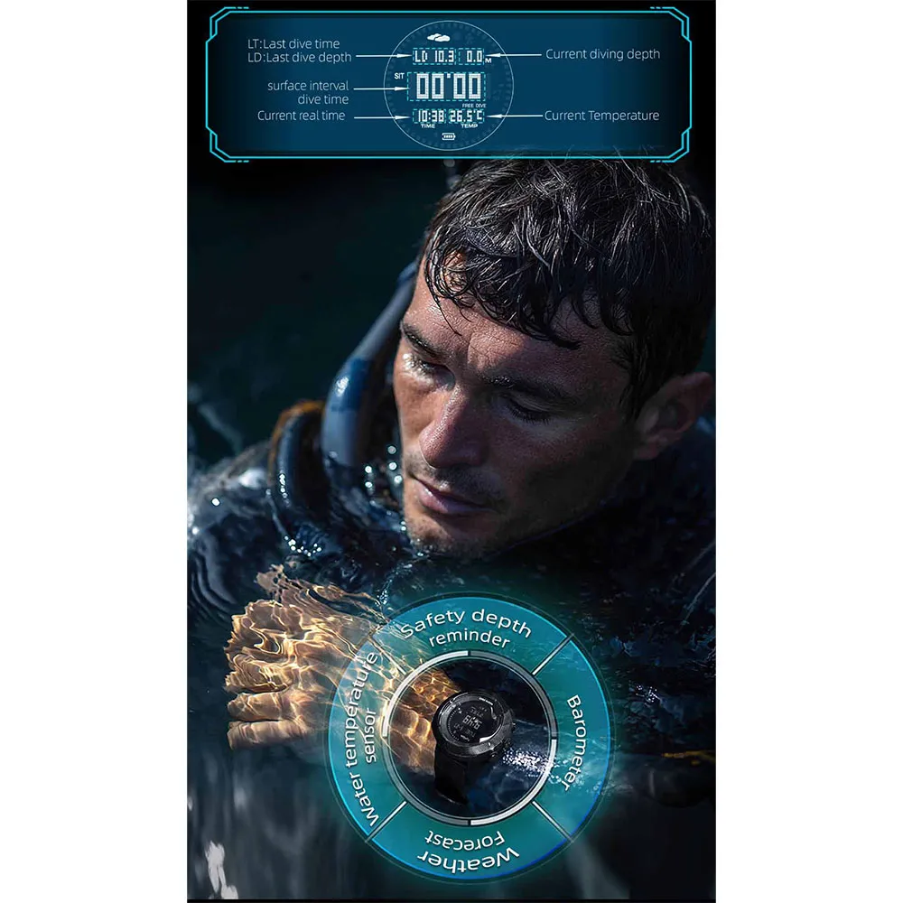 With 10ATM water resistance (50 meters), real-time depth tracking, rapid ascent alerts, and free diving mode, it ensures diving safety. A high-contrast display and large buttons make operation easy even in bright light or while wearing gloves.