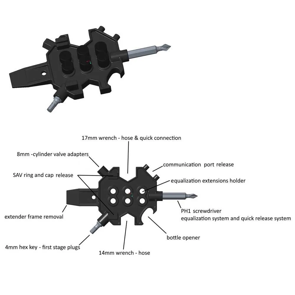 * Enhanced Self-Sufficiency: Take control of your gear´s performance. Whether you need to fine-tune your second-stage regulator´s breathing resistance or perform a quick visor swap, this tool gives you the autonomy to maintain your mask to your personal preference.