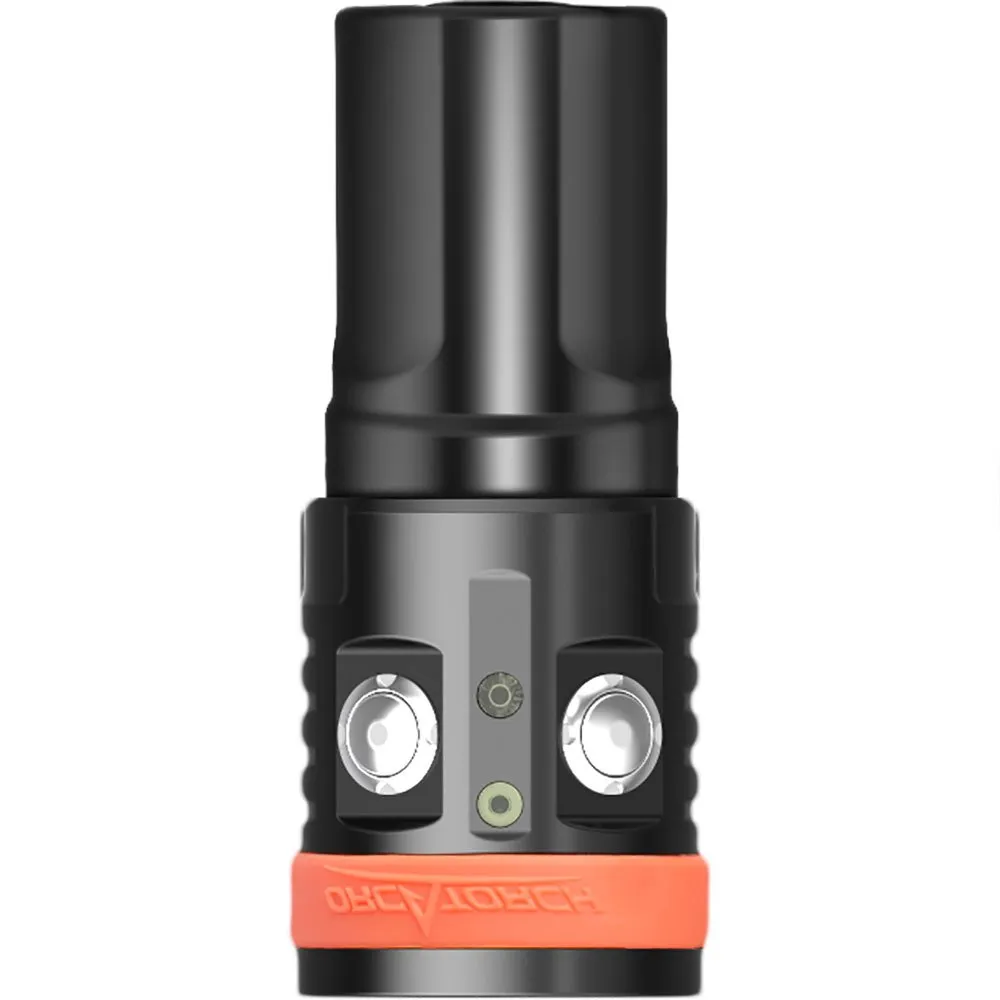 OrcaTorch D900V is a video light specially designed for the underwater photographer. It features four colors within one light: Red, UV, Neutral white with 120°wide beam and Cool white with 8° spot beam. With the industry’s first magnetic fast charging technology, the light can be charged without taking out the battery. The unique designed dual titanium alloy button system can control different lighting source independently, and its locking function can perfectly avoid accidental use. The dually LED indicator design offers instant knowledge of remaining battery level.