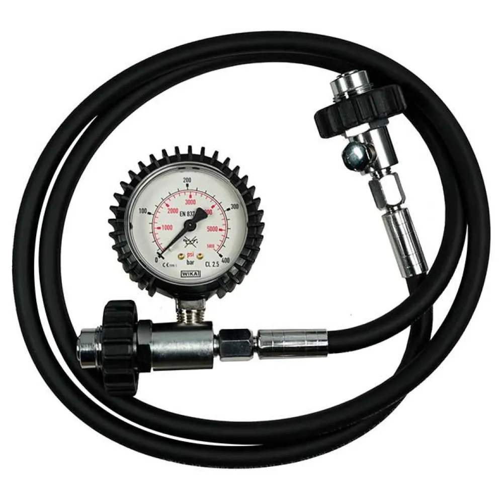 Air transfer hose, one and a half meters long, with DIN connections at both ends and a pressure gauge to measure air pressure. Working pressure 200 bar.
