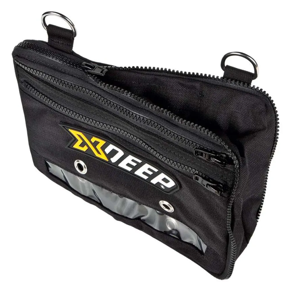 Main pocket (24cm x 18cm) stores wet notes, spare mask, foldable snorkel, touch, nautilus lifeline, small water bottle most are clipped off to the two internal d-rings. Small front pocket stores whistle and cutting tool. The two non-branded double ended bolt snaps are nice and short. This Pocket will do the job nicely. 5⭐️