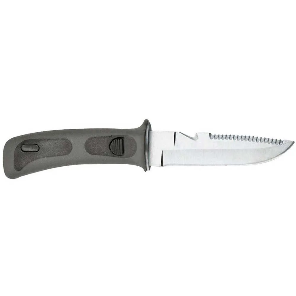 Buen cuchillo de buceo. Un poco grande, pero con un mango muy adecuado incluso si lo usas con guantes.