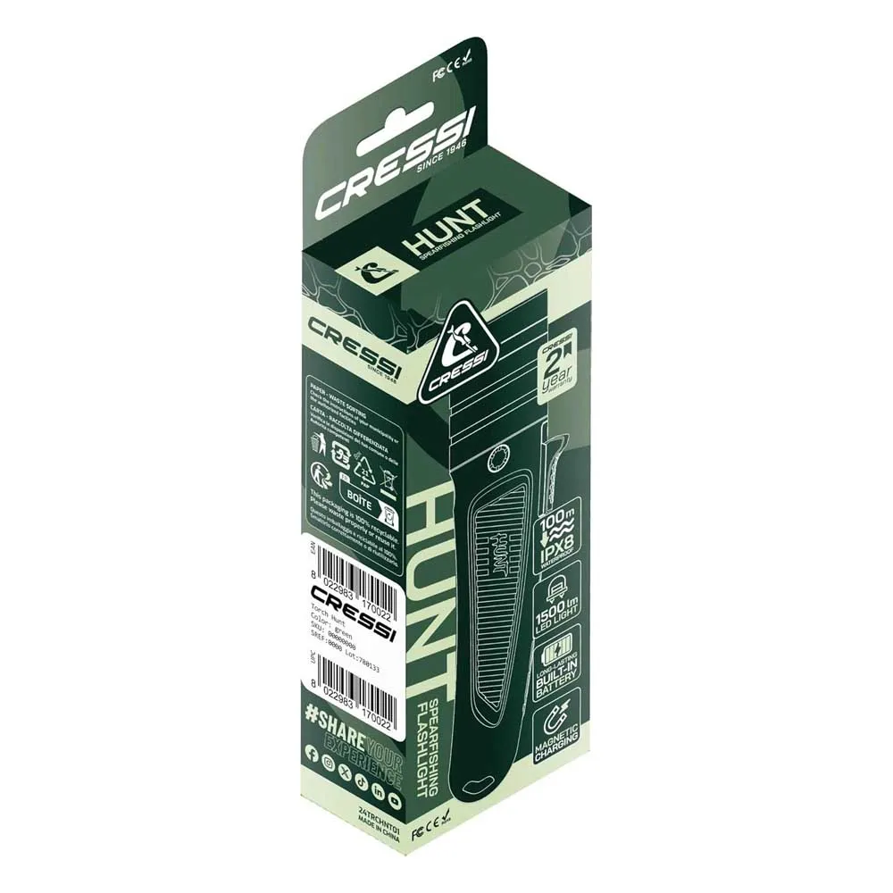 Incluido en la Caja: Linterna CRESSI Hunt, Batería Recargable, Cable de Carga USB, Correa de Muñeca Ajustable