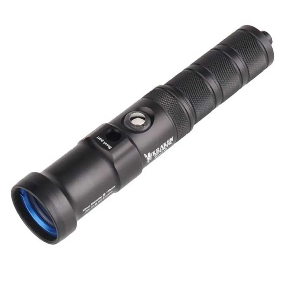 Más allá de su función principal como linterna de buceo, la KRAKEN Snoot V2 también destaca como una potente linterna. Su amplio ángulo de haz en modo linterna proporciona una iluminación amplia para actividades sobre el agua, lo que la convierte en una herramienta versátil para acampar, navegar y situaciones de emergencia. La batería de larga duración garantiza un rendimiento fiable, incluso durante un uso prolongado. Especificaciones técnicas: