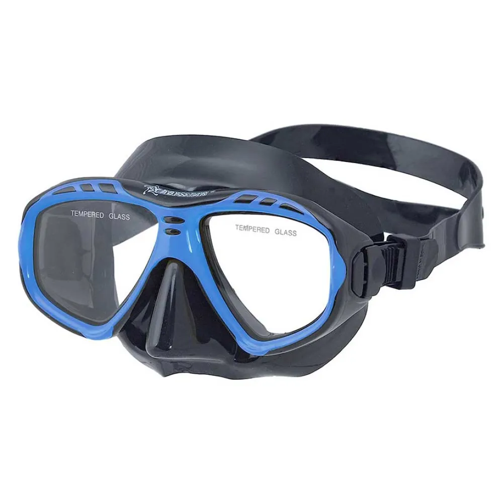 Kaksilinssinen maski, jossa on hypoallergeeninen materiaalihelma turvallista ja mukavaa istuvuutta varten.