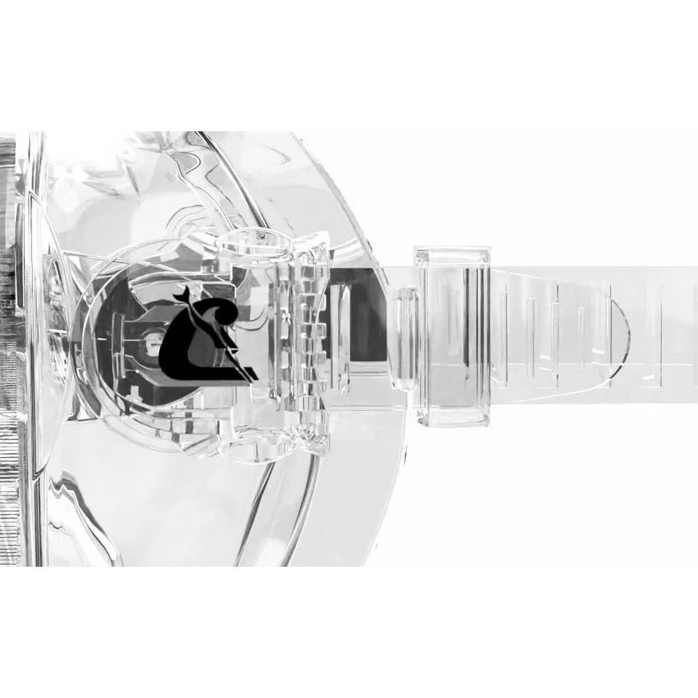 KEHYKSETÖN SOVITUS: Silikoninen kasvosuoja on kiinnitetty suoraan linssiin ilman kehystä. Tämä järjestelmä takaa erinomaisen näkyvyyden kaikkiin suuntiin, erityisesti sivuille, koska se mahdollistaa maksimaalisen läheisyyden silmän ja linssin välillä aiheuttamatta epämiellyttävää painetta otsaan tai nenän yläosaan.