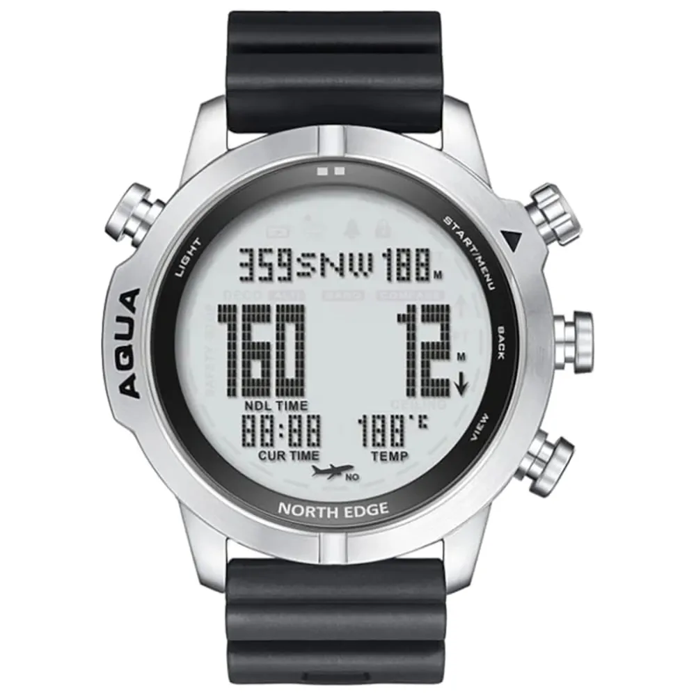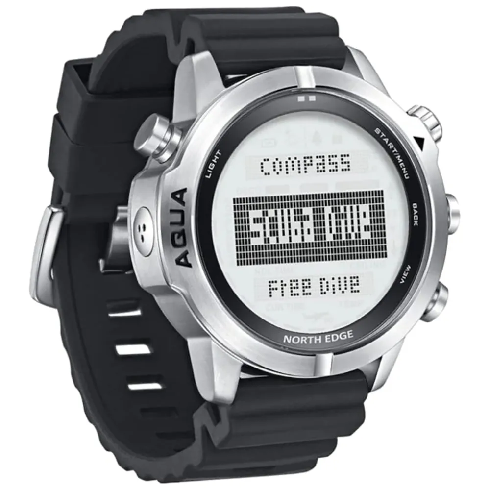 Esittelyssä North Edge Aqua, sukelluskello, joka on vedenkestävä 50 metriin asti ja sisältää ilmanpainemittarin, korkeusmittarin, kompassin ja lämpömittarin.