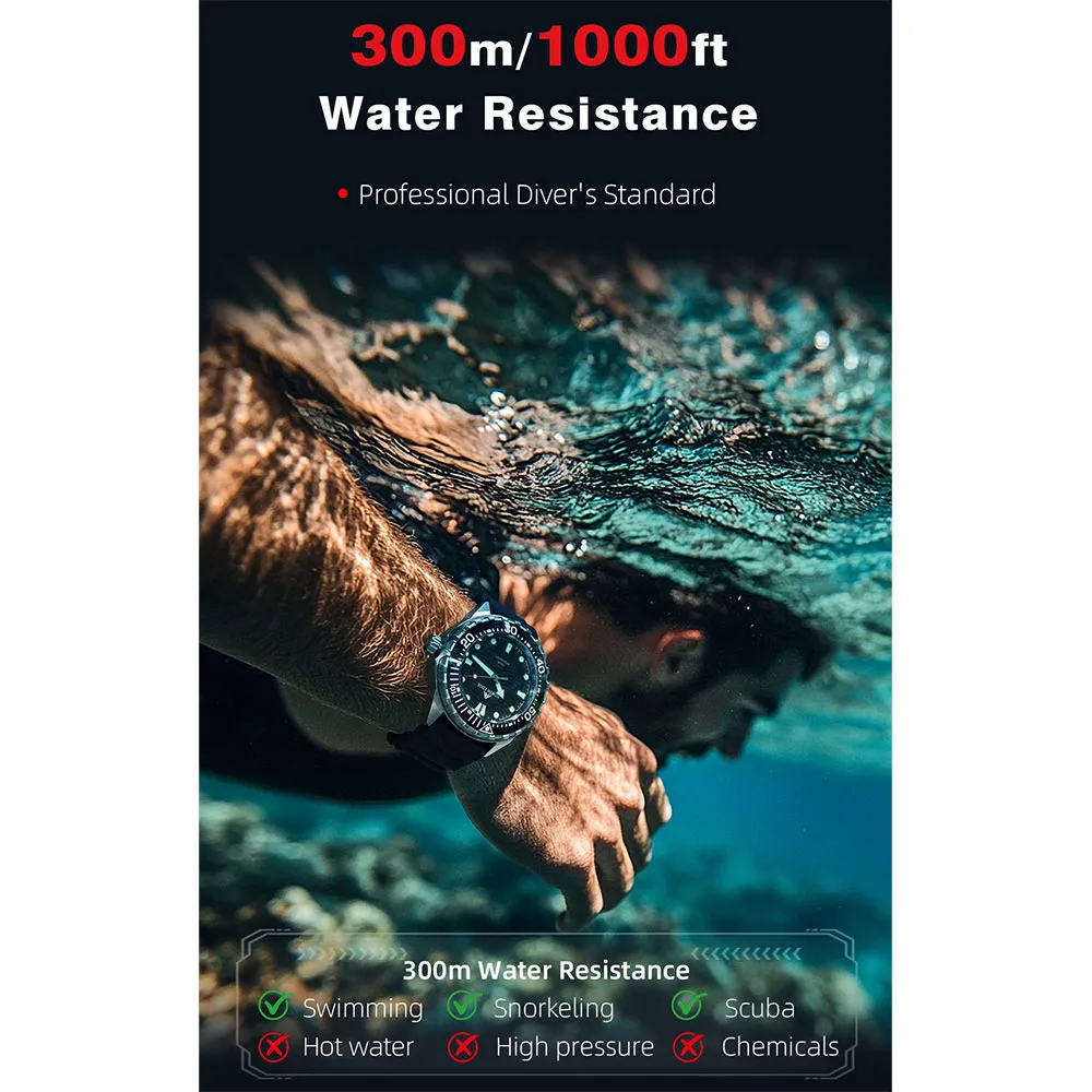Vedenpitävä 300 metriin asti, sopii monenlaisiin vesiurheilulajeihin, on ihanteellinen varuste ulkoiluseikkailuihin ja sukelluksen harrastajille.