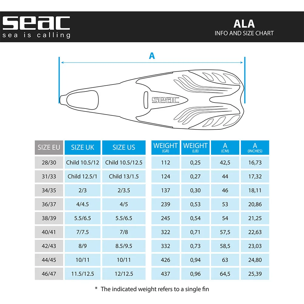 Seac Ala on snorklausfinni, joka sopii koko perheelle, saatavana 9 koossa, jotta se sopii 28-47 jalkaan, ja 4 värissä: valkoinen, sininen, keltainen ja pinkki.