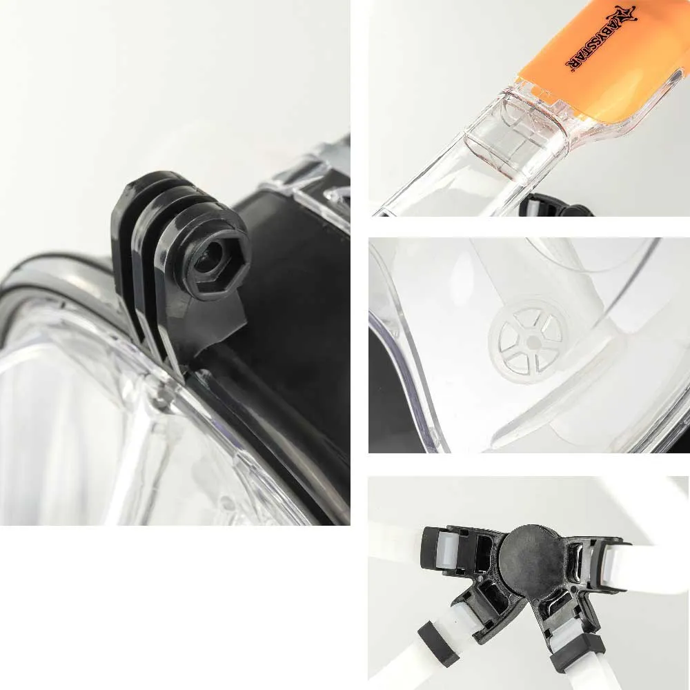 Comprend des valves internes antibuée, un conduit d´évacuation du CO2, un embout buccal étanche, un support pour caméra d´action et des sangles réglables en silicone avec fermeture à clip.