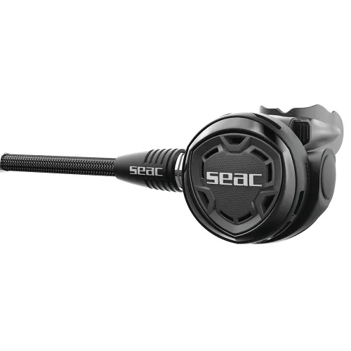 Le bouton de purge de taille généreuse, en PU souple bi-matière rehaussant le logo SEAC, fait partie intégrante du capot frontal agrémenté de finitions brillantes et mates, optimise les deux opérations même avec des gants épais, et le passage de l´eau, réduisant l´effort respiratoire et évitant, compte tenu de la synergie entre les ouvertures avant et latérales, un éventuel écoulement libre dû à la force des courants déviés par le capot frontal.