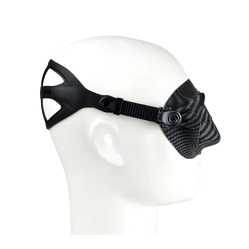 Il cinturino è fissato alla maschera tramite due morbidi supporti a fibbia che si inseriscono sul bordo della montatura lenticolare mediante una fascia perimetrale di dimensioni doppie rispetto allo standard.