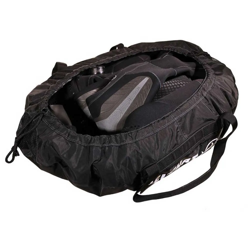 Zodra je bent omgekleed, gebeurt de magie. Laat je druipende wetsuit, laarzen, handschoenen en andere accessoires eenvoudig in het midden van de open mat liggen. Door vervolgens aan de robuuste, eenvoudig te gebruiken trekkoorden te trekken, trekt de mat naadloos samen en verandert deze in een veilige, waterdichte tas. Het duurzame sluitsysteem, met betrouwbare shifters, zorgt ervoor dat al het water en zand in de tas blijft, en niet op de bekleding van je auto. Dit betekent dat je je droogpak of wetsuit mee naar huis kunt nemen zonder zelf nat te worden en, het belangrijkste, zonder de kofferbak van je auto nat te maken, waardoor schimmel en waterschade worden voorkomen.