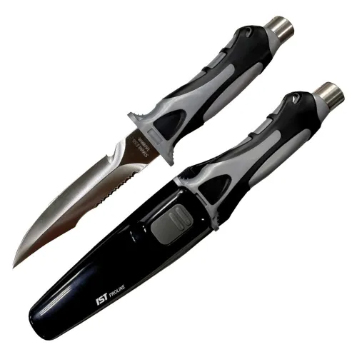 Het IST DOLPHIN TECH Navy 2 mes in het zwart is een veelzijdig en duurzaam gereedschap dat is ontworpen voor gebruik onder water. Dit mes is gemaakt van hoogwaardige materialen en is perfect voor duiken, speervissen en andere wateractiviteiten. Het lemmet is scherp en sterk, met een gekartelde rand om door harde materialen te snijden. Het handvat is ergonomisch ontworpen voor een comfortabele grip, zelfs met handschoenen aan. Het mes heeft ook een veilige schede voor veilige opslag en eenvoudige toegang. Dit accessoire is een must-have voor elke serieuze duiker of watersportliefhebber.