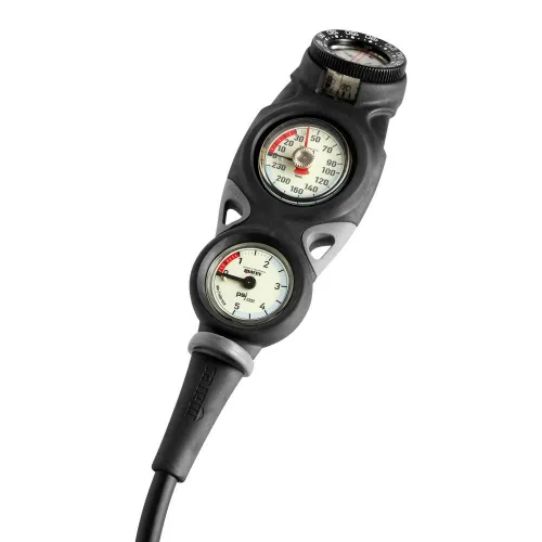 Een analoge console met druk- en dieptemeters, aangevuld met een speciaal compact kompas. Schokbestendige behuizing met optimale inclinatie voor eenvoudige en gelijktijdige aflezing van instrumenten en kompas. Met de mogelijkheid om de analoge dieptemeter achteraf te vervangen door een Puck capsulecomputer. In de Mission 3 triple console zijn de manometer, analoge dieptemeter en kompas inbegrepen. Het is ook mogelijk om de dieptemeter in deze console op een later tijdstip te vervangen door de Puck-computer. Het meest interessante aspect van deze lay-out is de schuine positie van het kompas, waardoor de twee instrumenten (kompasrichting en luchttoevoer) gelijktijdig kunnen worden afgelezen. De manometer is geschikt voor een druk van 300 bar en is geïntegreerd in een schokbestendige kunststof behuizing.