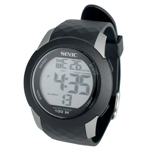 Seac Chronos er en sporty klokke med en tydelig digital urskive og en fasettert gummireim. Seac Chronos er tilgjengelig med rød, blå eller svart rem. Den er vanntett ned til 100 meter.