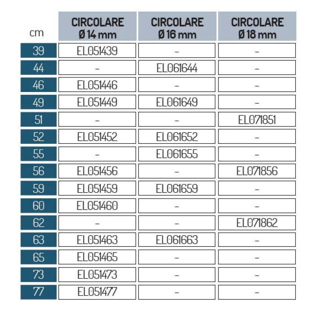 są to kody „mówiące”. 7. i 8. cyfra to rozmiar w cm. https://www.omersub.com/wp-content/uploads/2019/04/code-performer2bands-2.jpg EL051444NF: średnica 14 mm długość 44 cm. EL051439NF: średnica 14mm długość 39cm. pozdrawiam Antonio