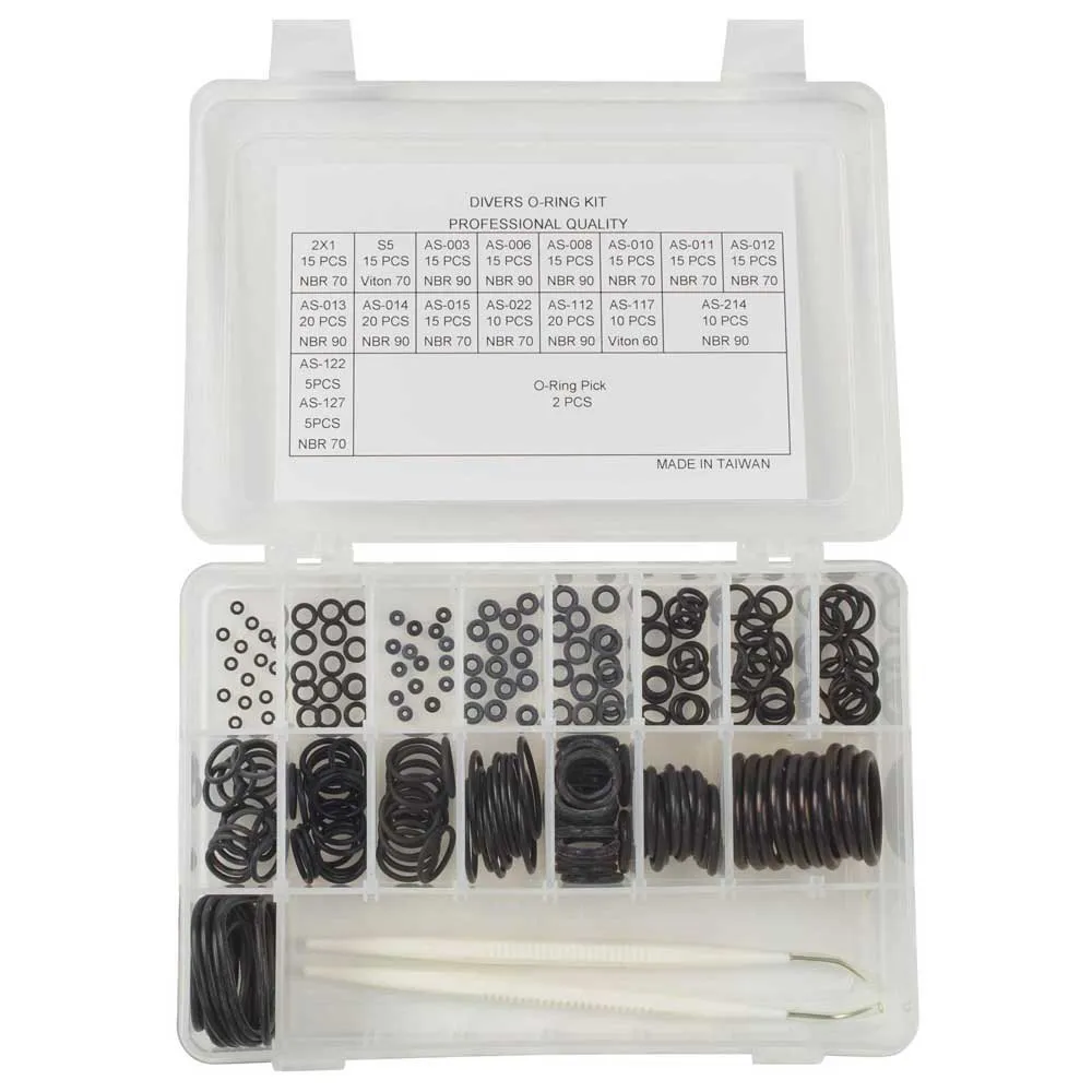 Ostateczny zestaw „save a dive”. 16 różnych rozmiarów O-ringów, zawiera dwa picky. Zapakowany w przegródki z kluczem rozmiaru, który pomaga określić, który pierścień „O” jest potrzebny.