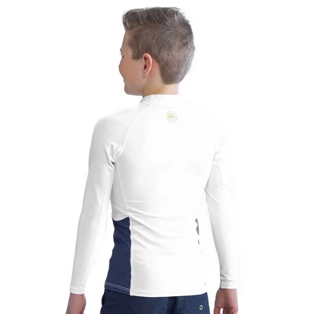 Proteção total da parte superior do corpo com esta manga comprida Rash Guard. Proteja seu filho dos raios solares nocivos. Projetado com uma construção costurada suave e tecido elástico de 4 vias, este protetor contra erupções cutâneas é a escolha perfeita.