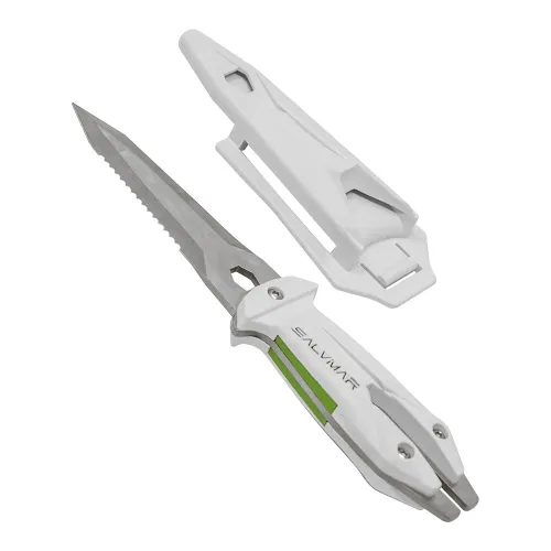 Esta faca de pesca submarina de alta qualidade apresenta uma lâmina super afiada e pontiaguda e construção robusta e durável. Seu cabo ergonômico oferece uma ótima aderência, embora alguns o achem compacto. A bainha de travamento seguro garante que a faca nunca seja perdida, liberando com um toque do polegar. Uma característica fundamental é o extrator de arpão integrado, perfeito para soltar arpões presos. Disponível em cores de alta visibilidade como branco e verde, é uma ferramenta funcional e elegante elogiada por seu excelente custo-benefício e desempenho