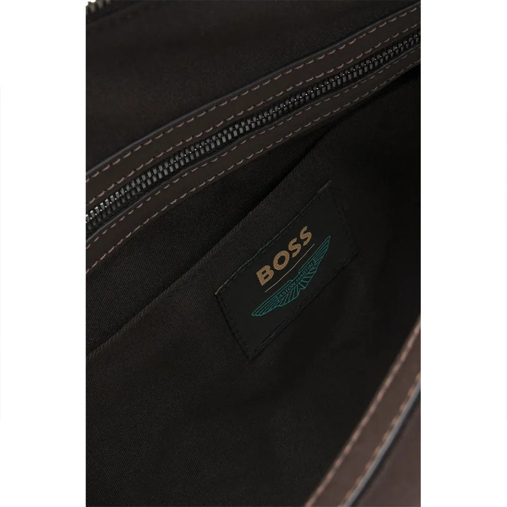 Metallisk Aston Martin-logo foran og præget Boss-logo på bagsiden.