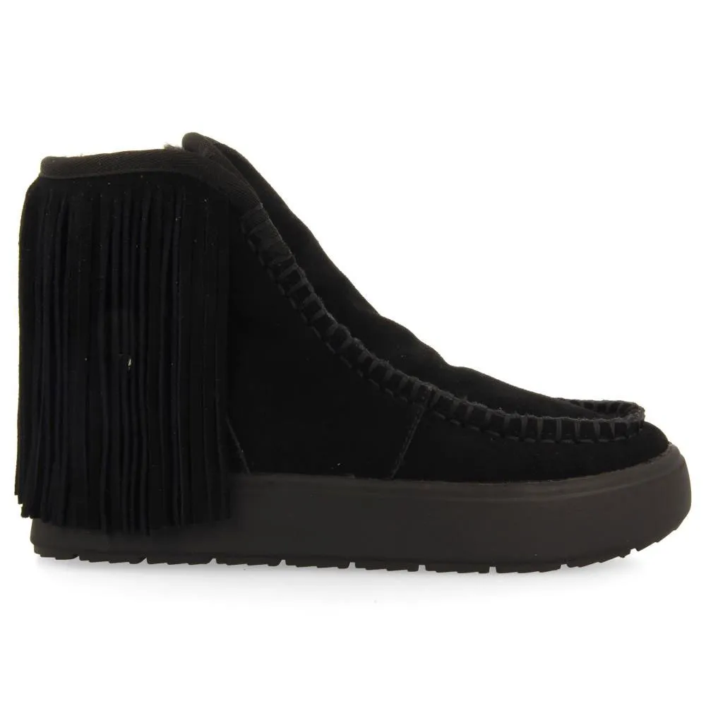 Sorte læderstøvler i australsk stil med frynser og indvendigt pelsfor.