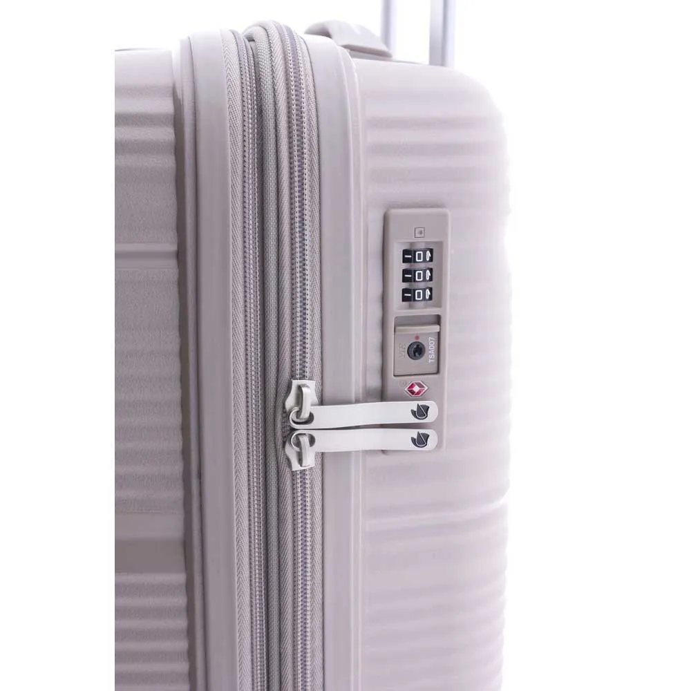 Fire dobbelthjul med detaljer i samme farve som kufferten.