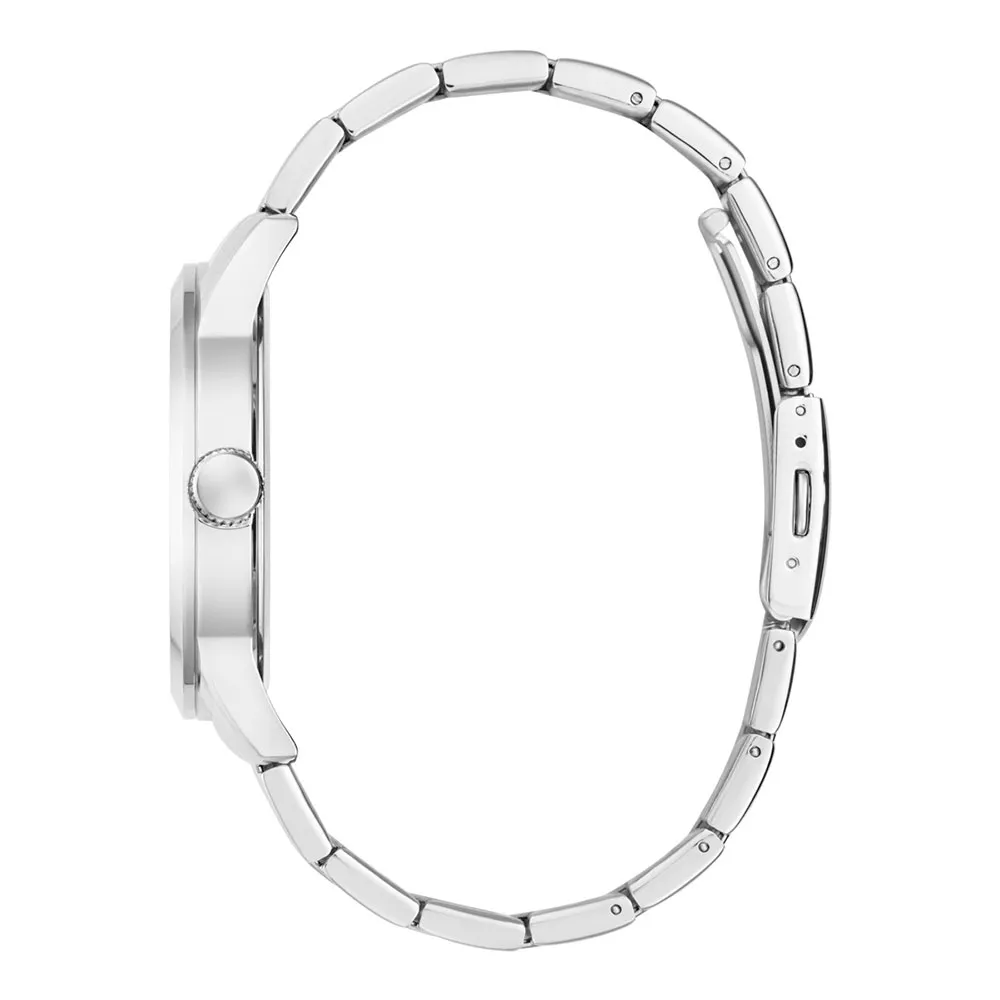 Den fængslende sunray-urskive fanger straks øjet og skaber et dynamisk spil af lys, der fremhæver dens rige tekstur og dybde. I hjertet ligger et dristigt, ikonisk ´G´-logo, der tjener som et bevis på GUESS´ arv af trendsættende stil og uovertruffen design. Denne fremtrædende funktion gør uret øjeblikkeligt genkendeligt og tilføjer et strejf af eksklusiv branding, der adskiller dig fra mængden. De slanke visere og timemarkeringer er designet til maksimal læsbarhed, hvilket sikrer, at du kan se tiden med et hurtigt, ubesværet blik.