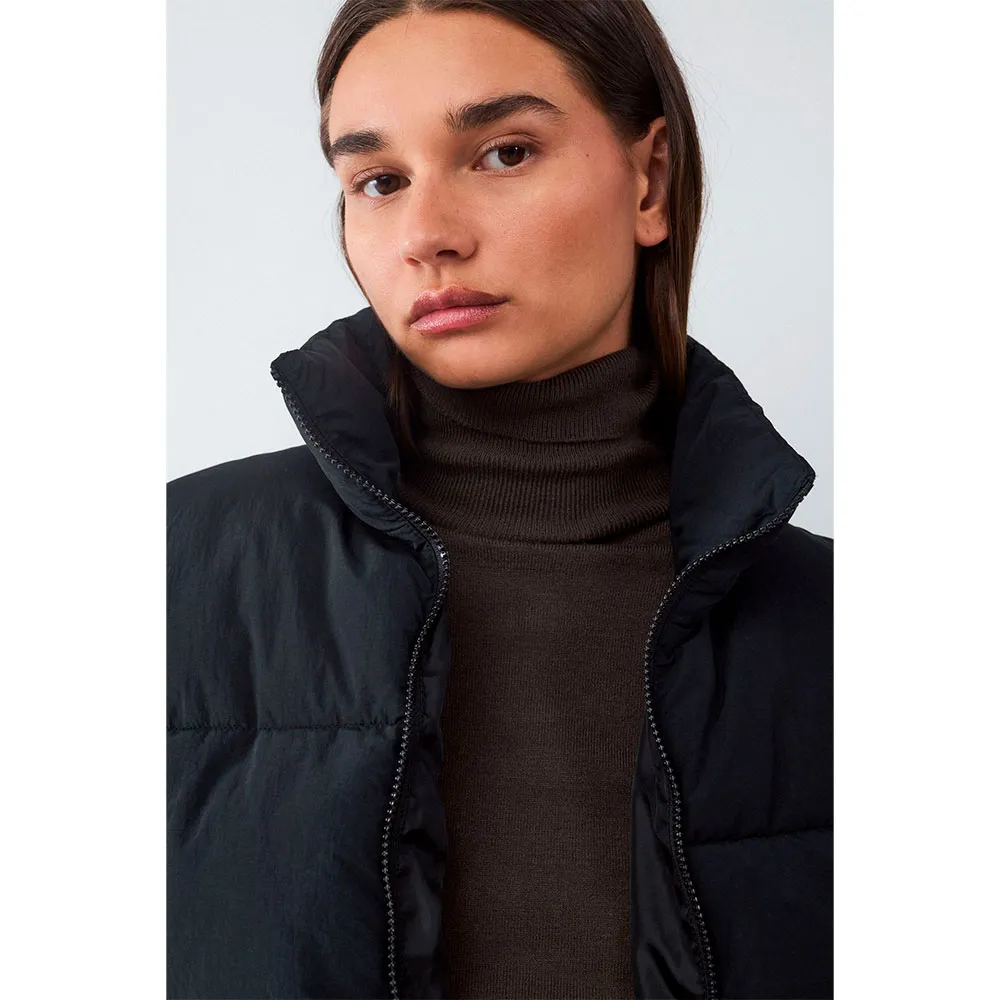 Details: Basic Steppmantel mit Stehkragen, Seitentaschen und Reißverschluss.