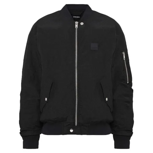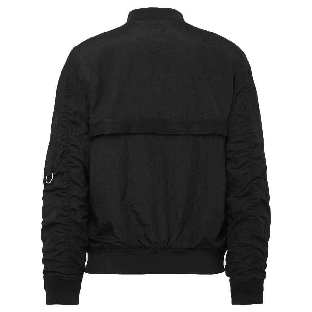 Dieser Bomber aus Crinkle-Nylon verfügt über eine vom Militär inspirierte Reißverschlusstasche und Klebebanddetails auf der Rückseite. Es ist mit einem diamantgesteppten Futter für Wärme ausgestattet und hat einen Gummi-D-Logo-Patch, der die Brust betont.