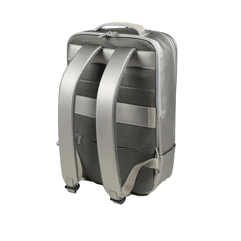 Minimalistischer Rucksack aus PU, gewonnen aus recycelten Plastikflaschen. Wasserabweisendes Material und Reißverschluss. Doppelfach mit Reißverschluss und versteckter Vordertasche. Hinteres Fach passend für einen 16-Zoll-Laptop. Gepolsterte und verstellbare Schultergurte. Gepolsterter und atmungsaktiver Rücken mit einem Gurt zur Befestigung an einem Koffer. Innenraum mit Reißverschlusstasche.