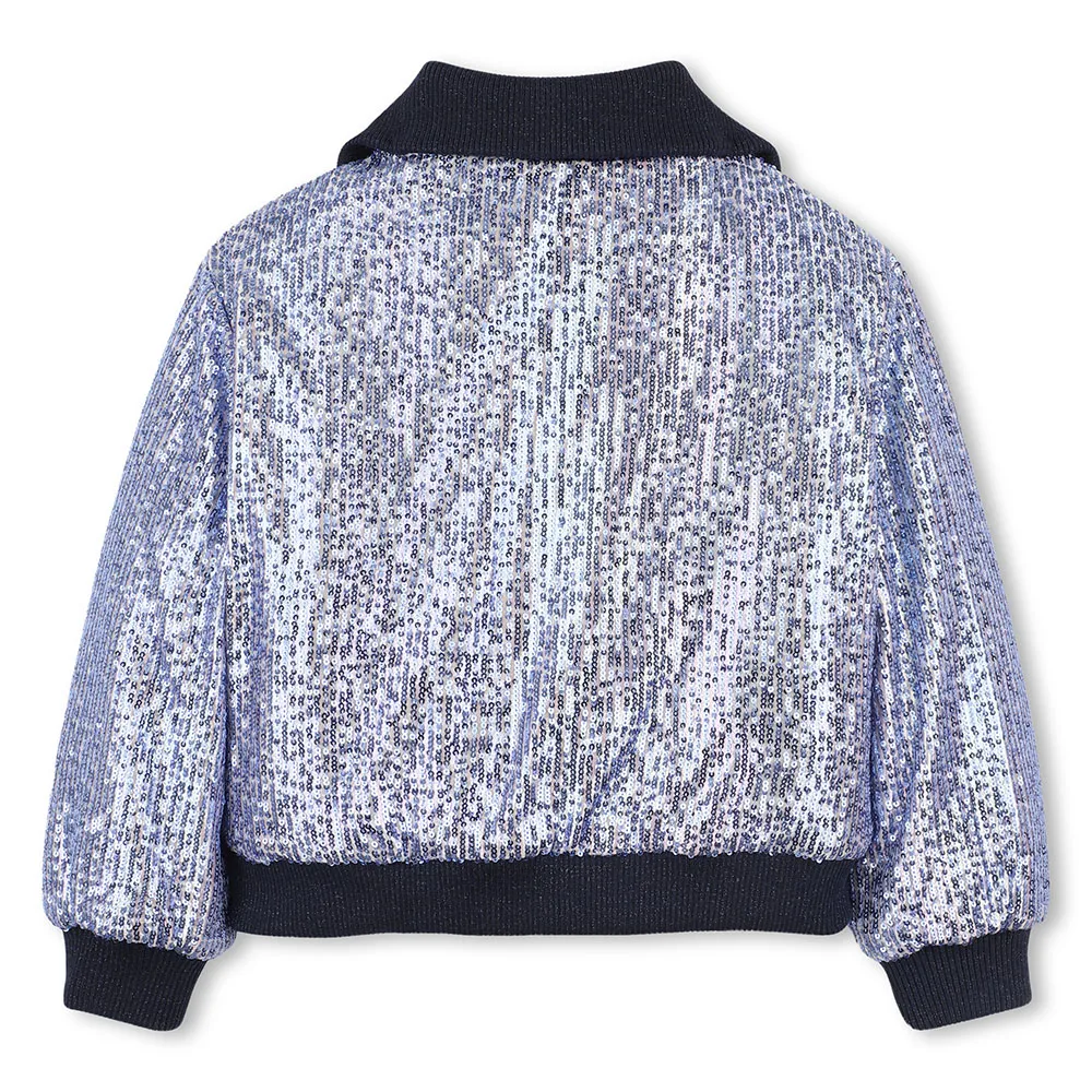 Sequin jacket, high neck, ribbed cuffs and hem, front zip closure, label.