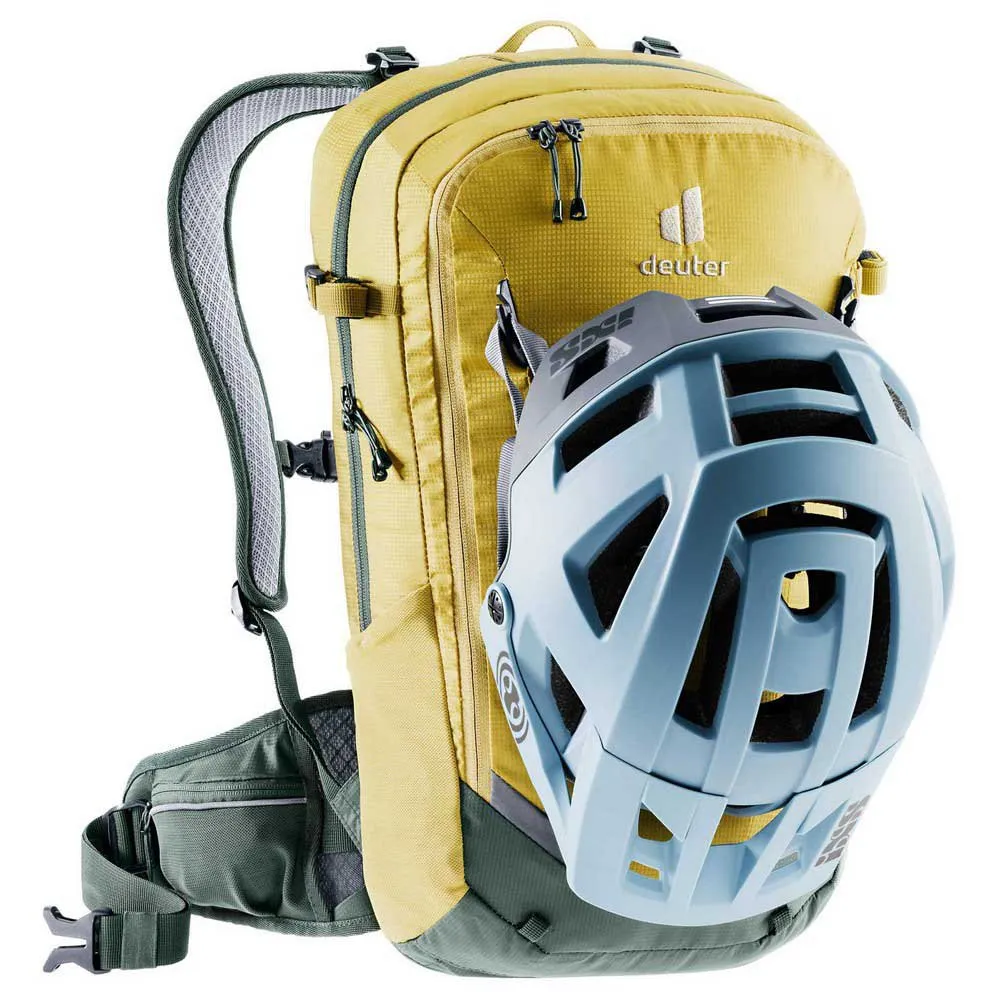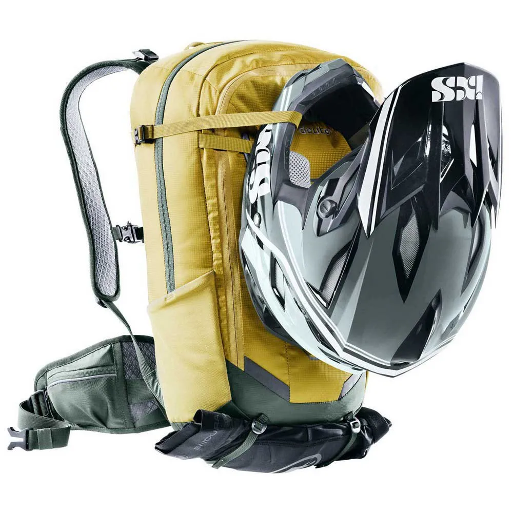 Pared down to the essentials, the new Flyt still has all the features you need for a big day on the trails: Clips to attach a half-shell helmet, side compression straps to attach a full-face helmet and two stowable gear straps for attaching protective gear to the outside of the pack. And of course, there’s the TÜV/GS-certified back protector that’s easy to remove and provides maximum safety for when things go wrong. The deuter Airstripes back system on the Flyt provides excellent ventilation across the back.
