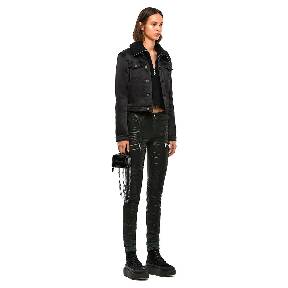 Trucker jacket made from viscose satin, with a tonal back in compact milano-knit fabric.