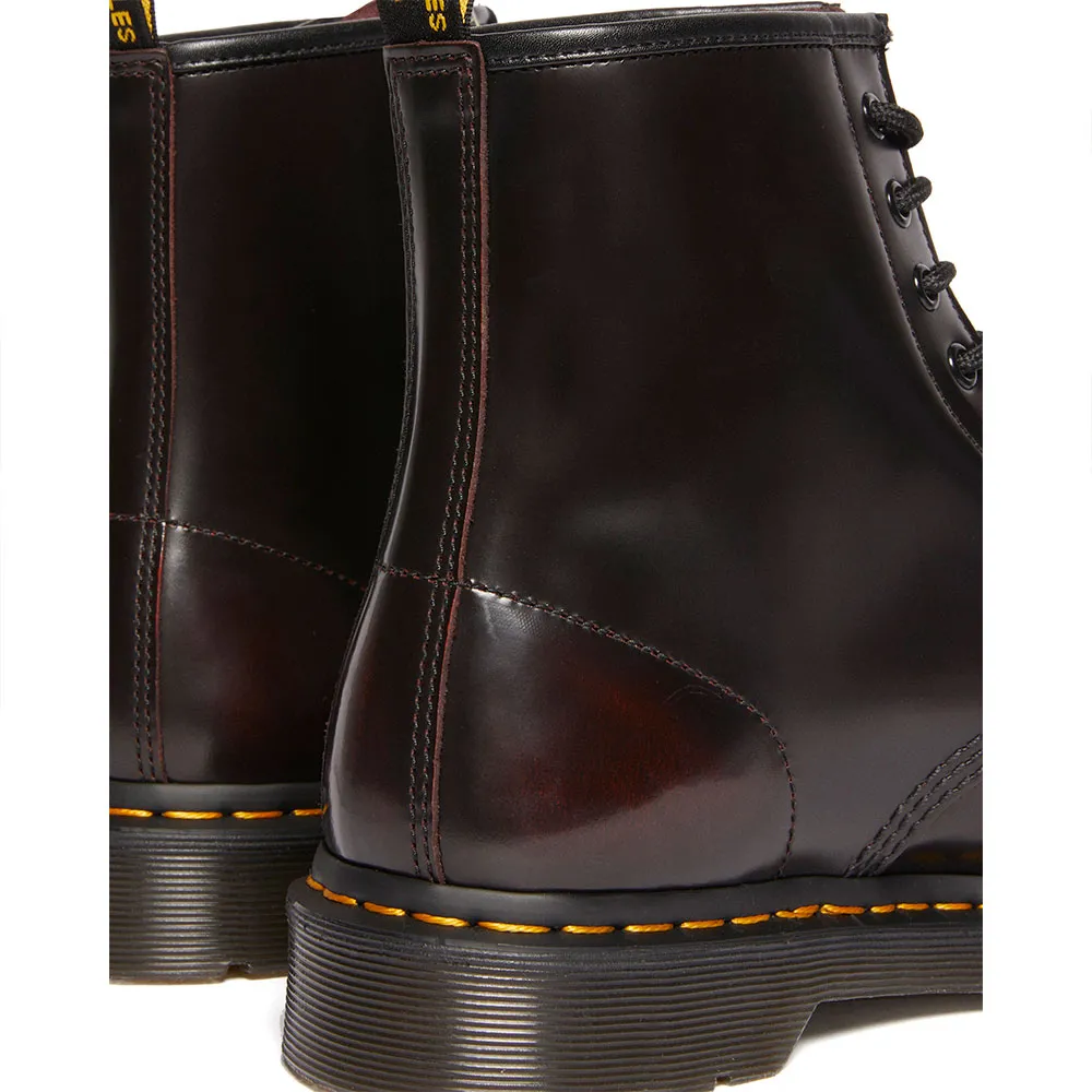 Our classic 1460 boot constructed from Arcadia, a high-shine archival leather that exposes more of the base cherry red tone through wear.