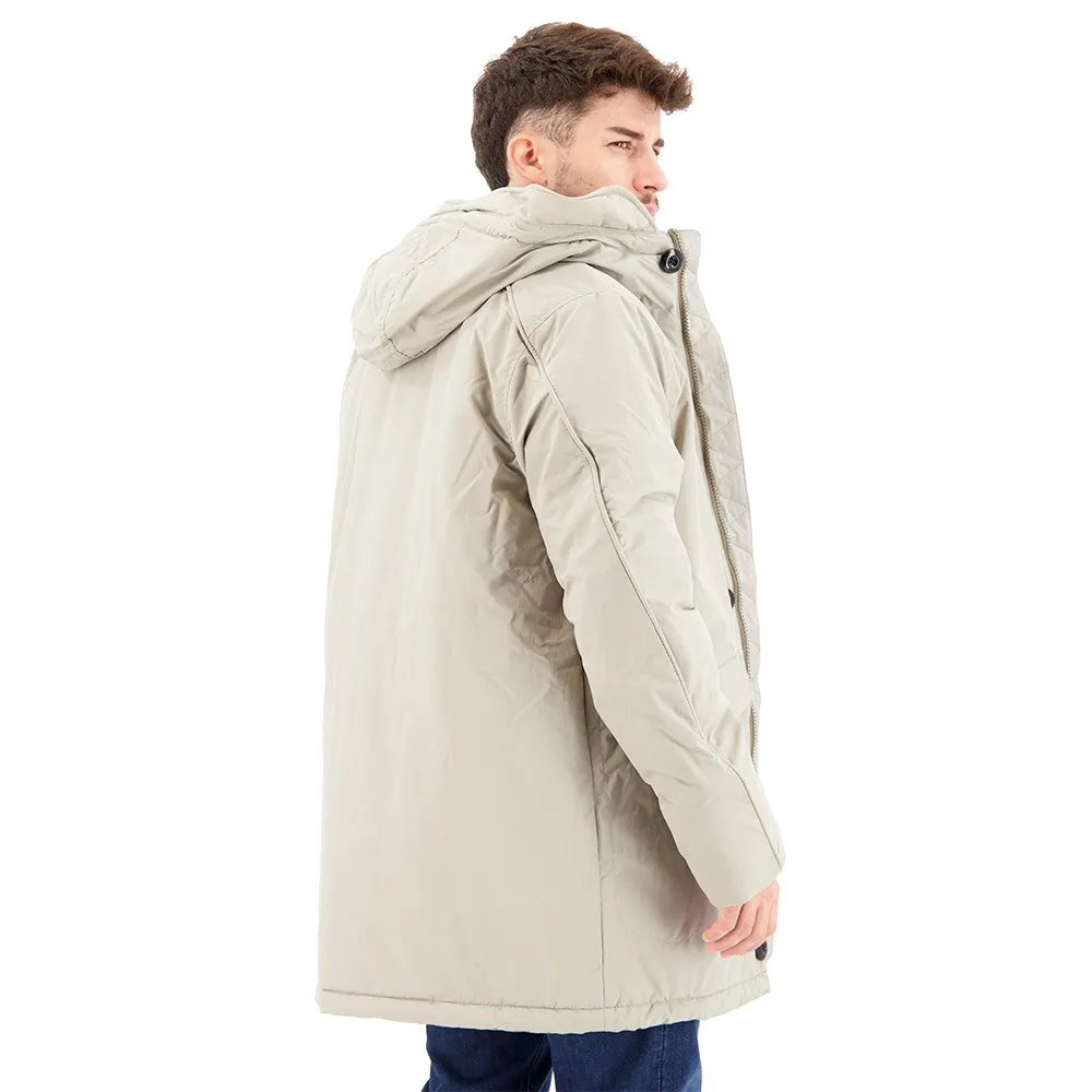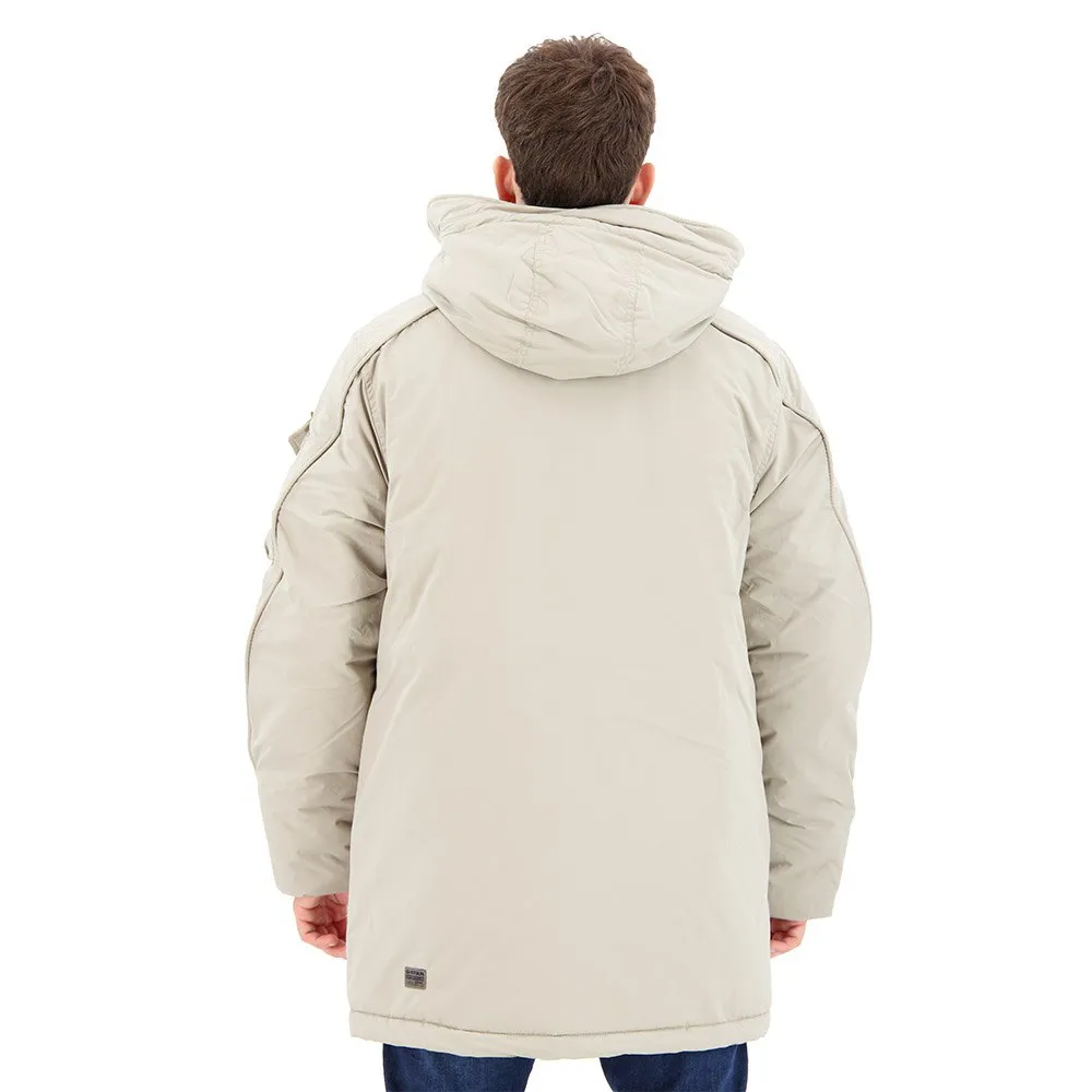 The padded Vodan parka offers a hood with a foldable peak, adjustable pull cords and a raised front. The 2-way zip closure is covered by a wind blocker panel and have a button closure. Also the sleeves offer wind protection by the ribbed cuffs that are placed on the inside. One of these show a flap pocket as well. This parka is designed with roomy waist pockets that have a flap with a hidden snap. An angled flap pocket is added to the chest, where the stitch down indicates the hidden snap button closure. At the inside a 2-piece pocket is combined with a pull cord to adjust the waist. A hanger loop is added for ease.