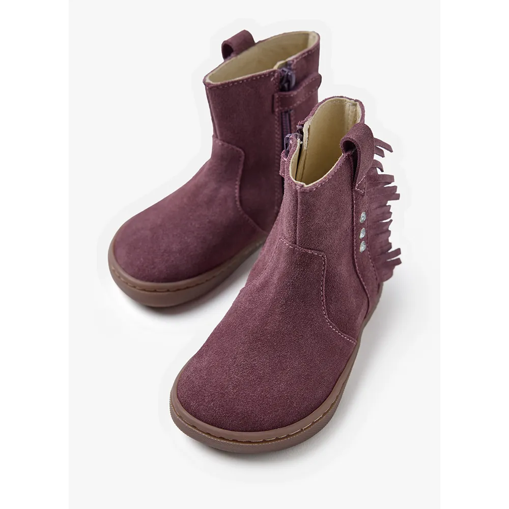 Suede leather boots with fringes and rhinestones.