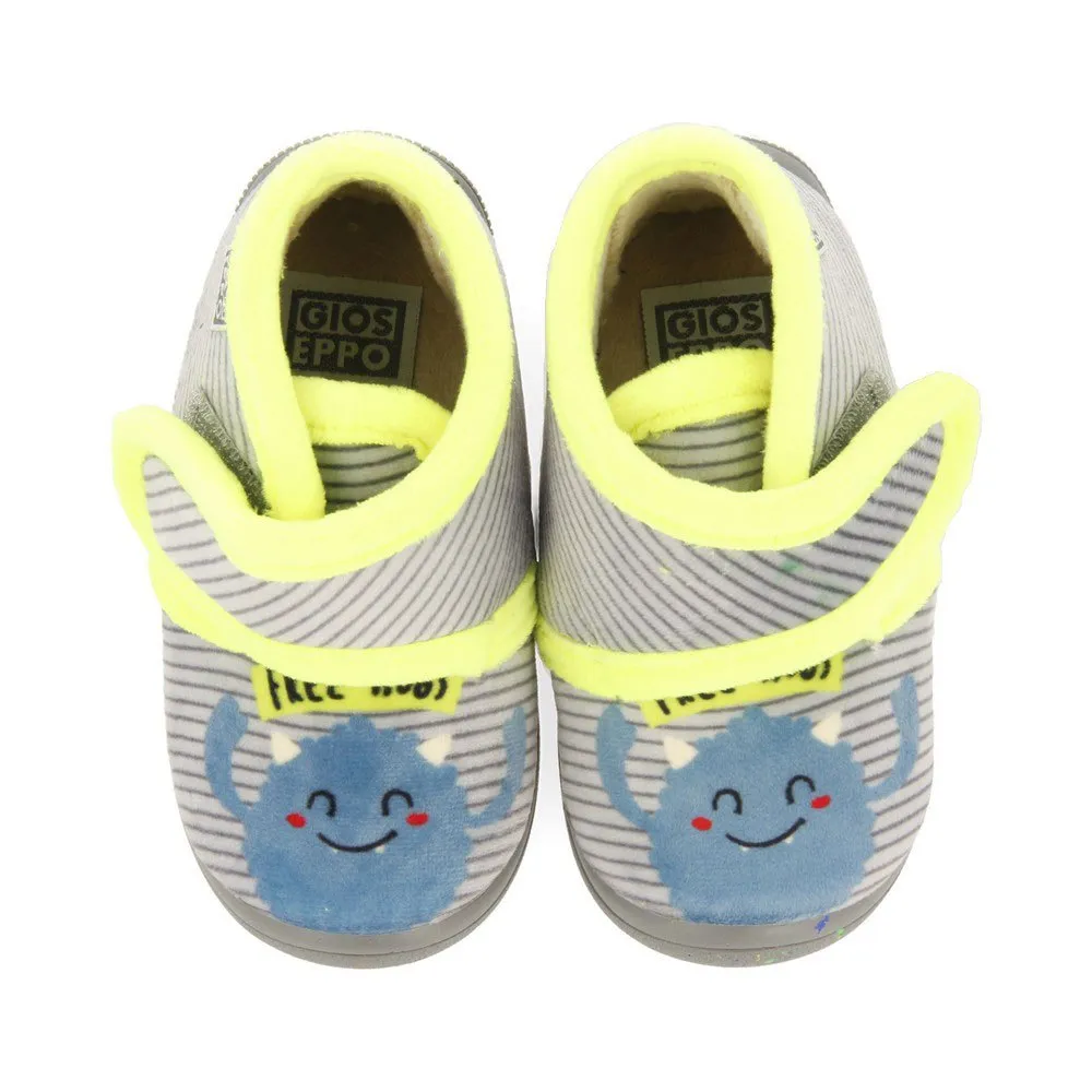 Their first steps at home in their gioseppo kids! very soft stripy grey bootie slippers with a monster print.