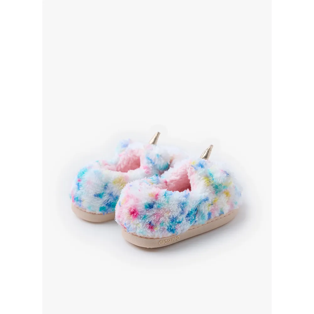Furry unicorn slippers with closed heel.