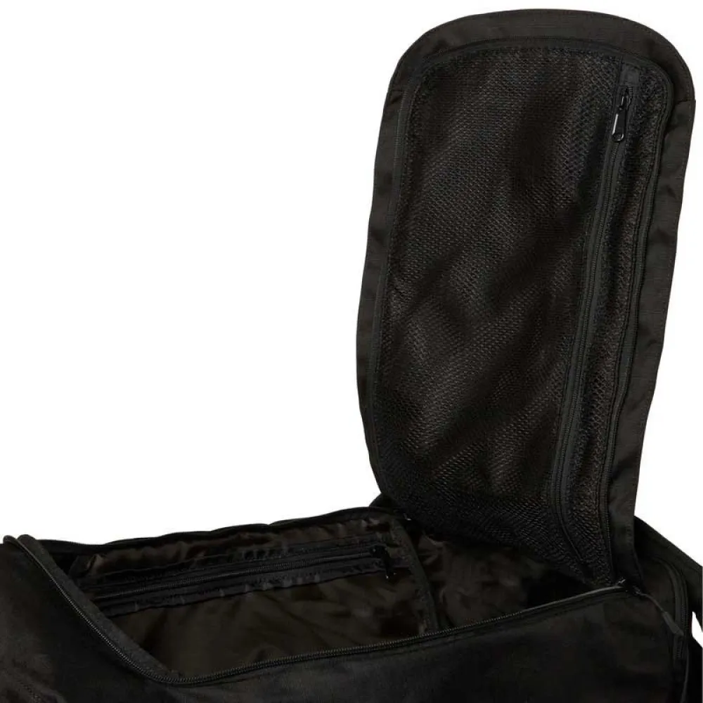 Adjustable shoulder straps are neatly stored in a dedicated pocket on the top lid and can be easily deployed so that you can carry the duffel as a backpack or cross-body bag.