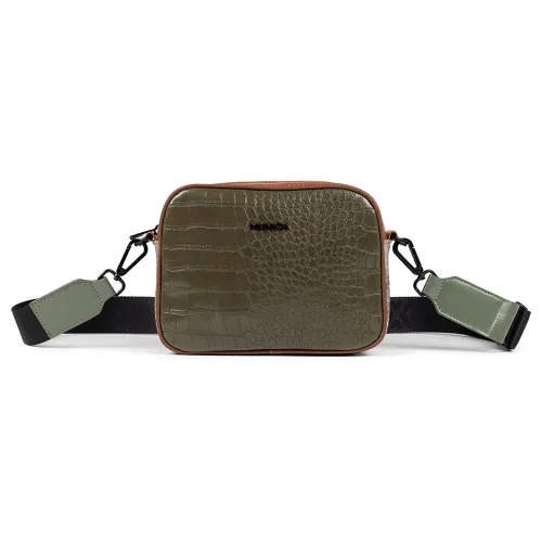 Crossbody bag made from a mix of embossed and printed synthetic leathers. Compartment at the back. Removable and adjustable shoulder straps. Interior with zipped pocket.