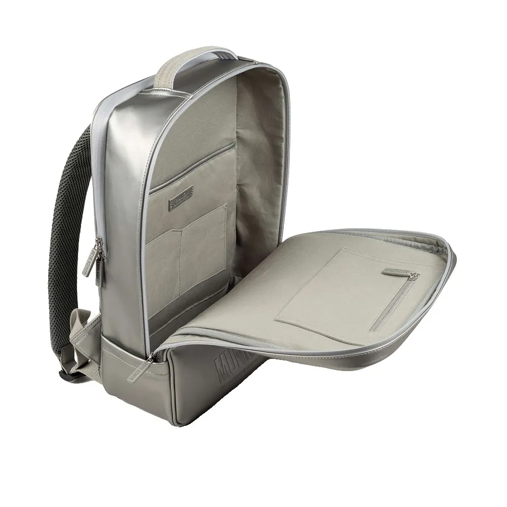 Minimalist-style backpack made from PU sourced from recycled plastic bottles. Water-resistant material and zipper. Double compartment with zipper closure and hidden front pocket. Rear compartment fits a 16´´ laptop. Padded and adjustable shoulder straps. Padded and breathable back with a strap for attaching to a suitcase. Interior with zippered pocket.