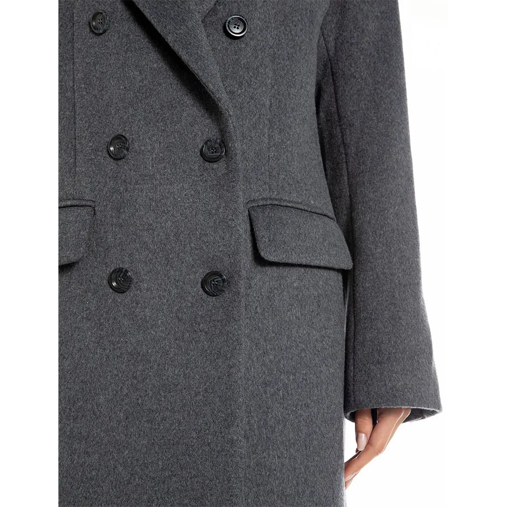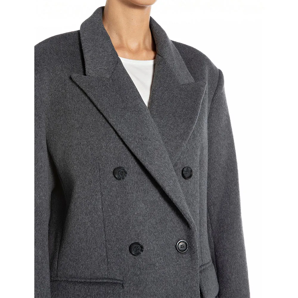This exquisite women´s coat is defined by its sharp, clean lines and thoughtful details. The design features a classic, structured silhouette that enhances your figure, creating a long and lean profile. A sophisticated double-breasted front closure, secured with a series of elegant buttons, provides a secure and polished finish. The traditional lapel collar adds a touch of sartorial authority, framing the face beautifully. Practicality is woven into its design with strategically placed pockets, perfect for keeping your hands warm or stowing small essentials. Crafted from a high-quality synthetic blend, this coat offers a luxurious feel and excellent durability, resisting wrinkles and maintaining its impeccable shape through regular wear. Every stitch and seam reflects a commitment to superior craftsmanship, making it a truly premium garment.