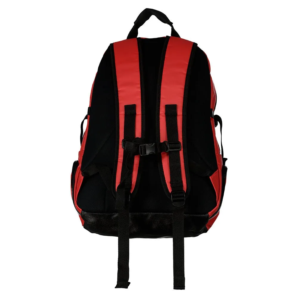 Features inserts made from nylon and elastane for greater flexibility and expansion. On the sides it has two elastic open pockets, made of mesh. On the sides it has compression straps with rubber buckles.