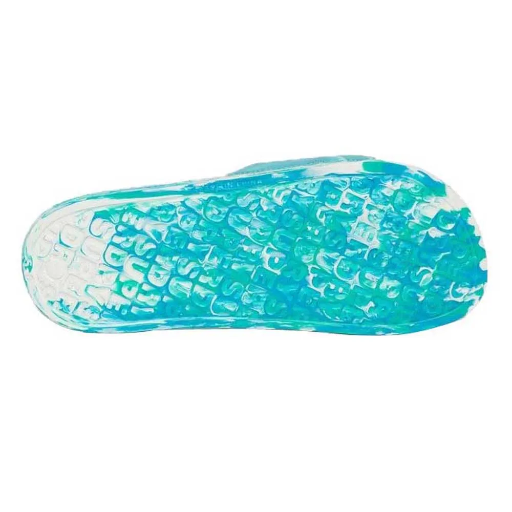 Moulded footbeds with graphic text across the strap and side of the sole.