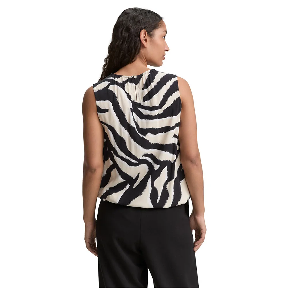 Patterned top in flowing viscose with a drawstring hem and button at the back of the collar.