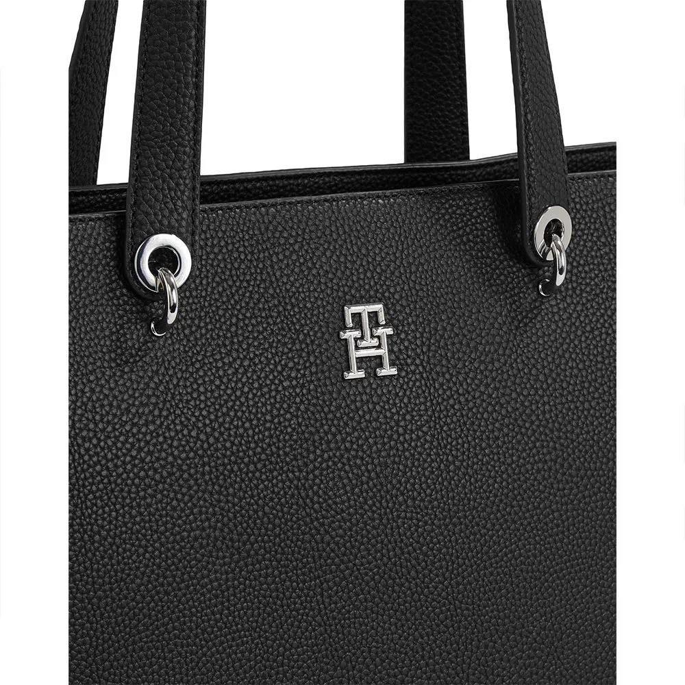 This elegant tote features a refined pebble grain texture and is complete with a TH monogram on the front.